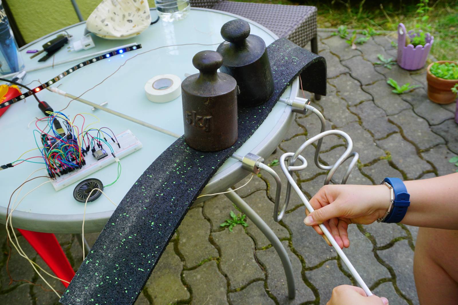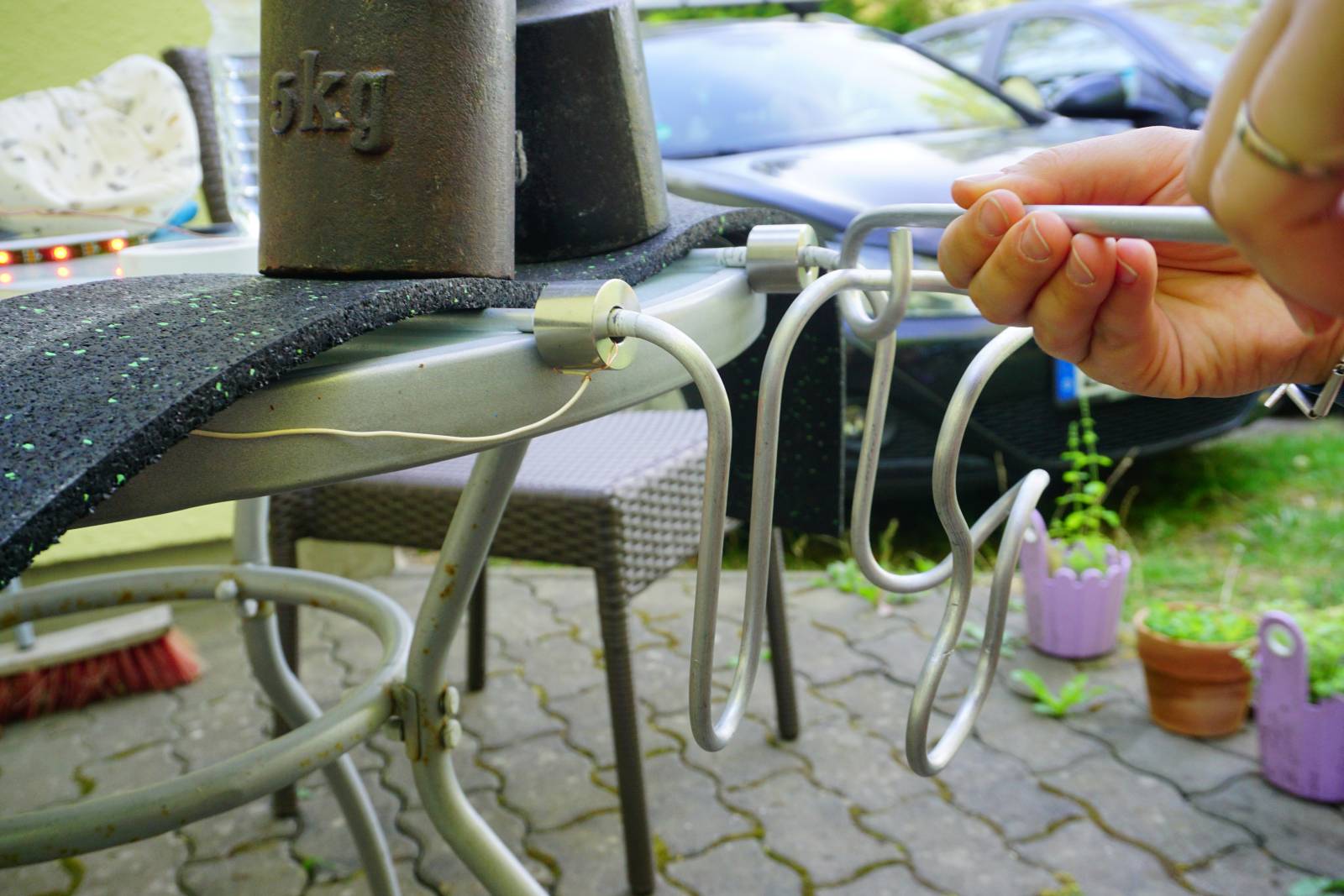 Direkt nach dem Biegen einer 2m Alu-Stange wurden die ersten Praxistests im Garten gemacht.