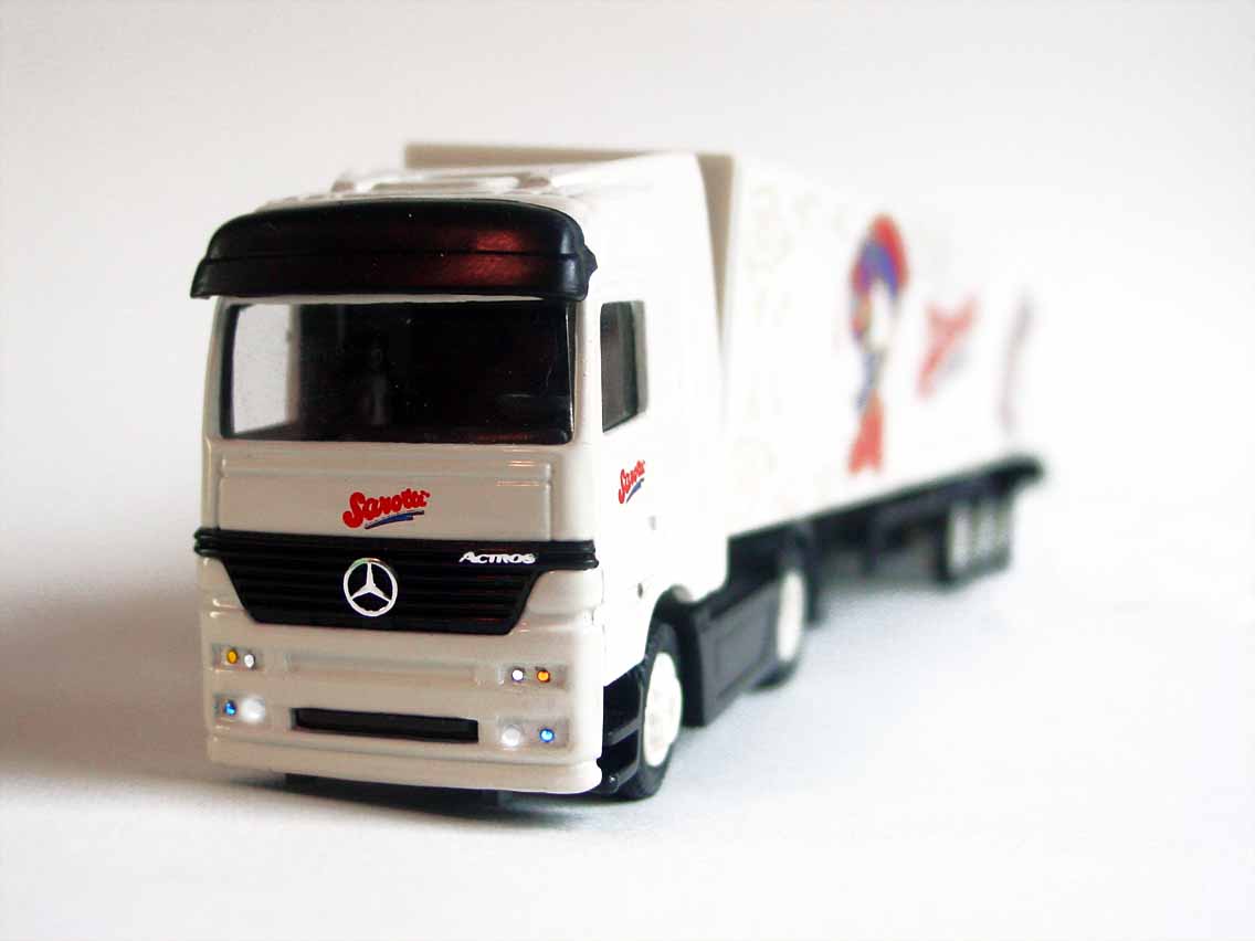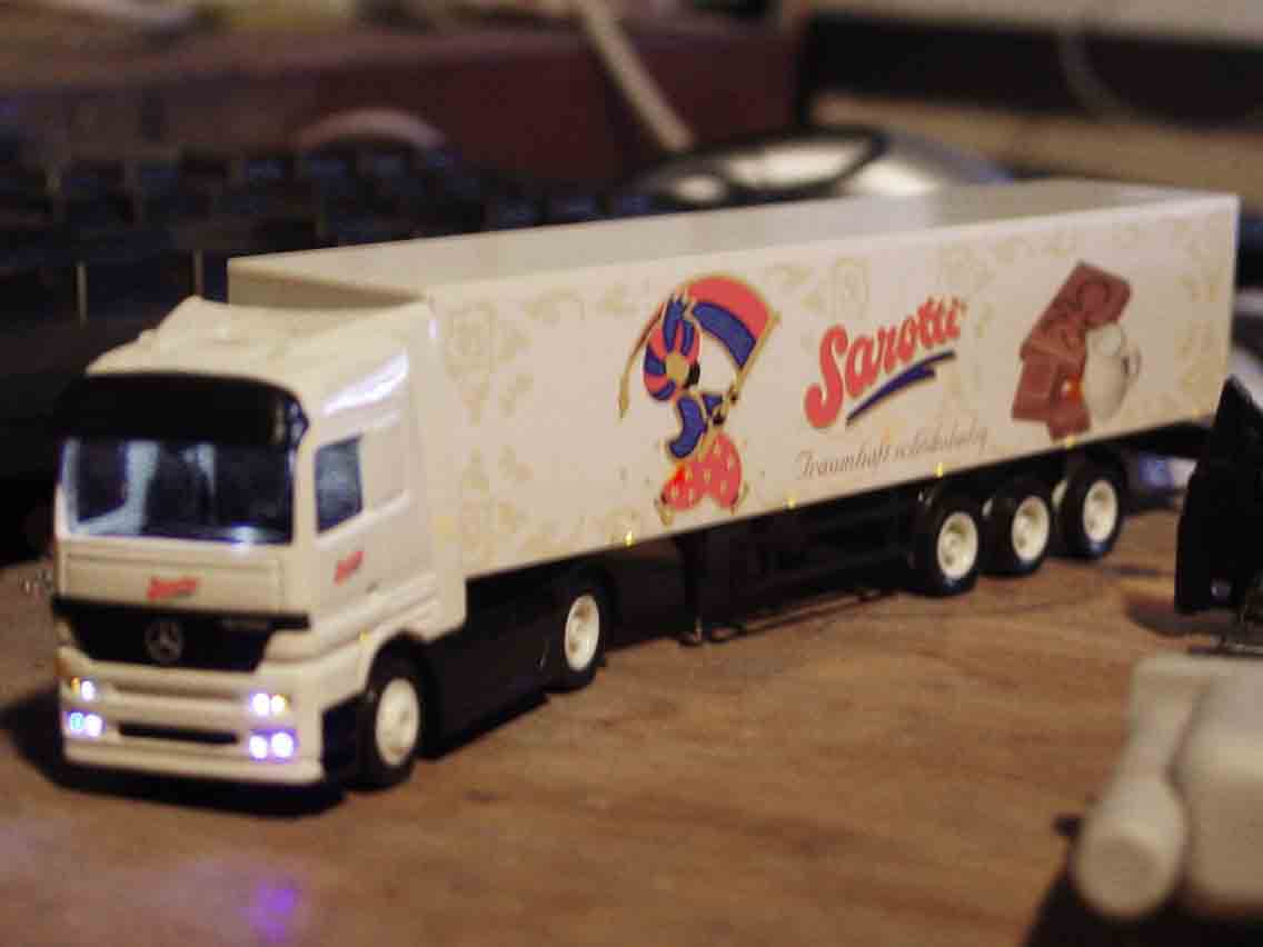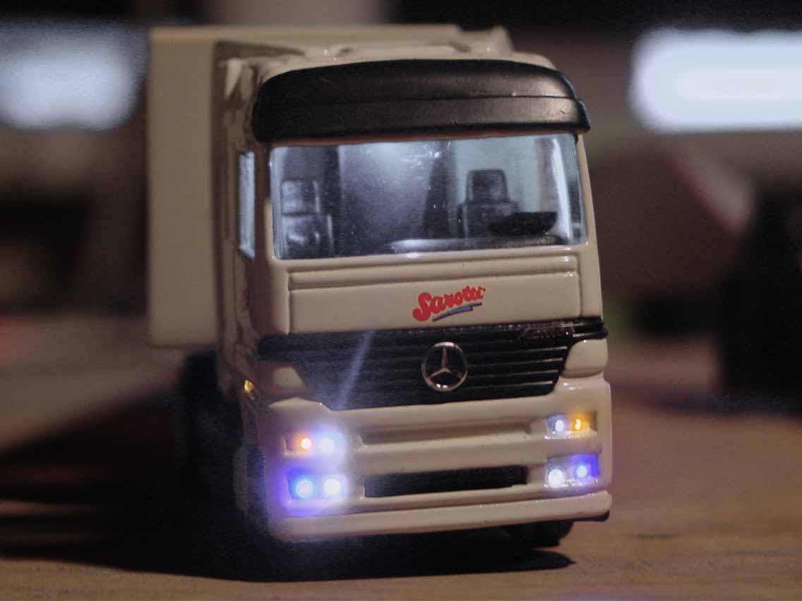 Dieser Truck ist eines meiner ersten Modelle. Seine Elektronik ist noch auf Lochrasterplatine aufgebaut und füllt den ganzen Sattel aus. Gesteuert werden seine Lampen per I2C-Bus, bei mir also mit dem PC.